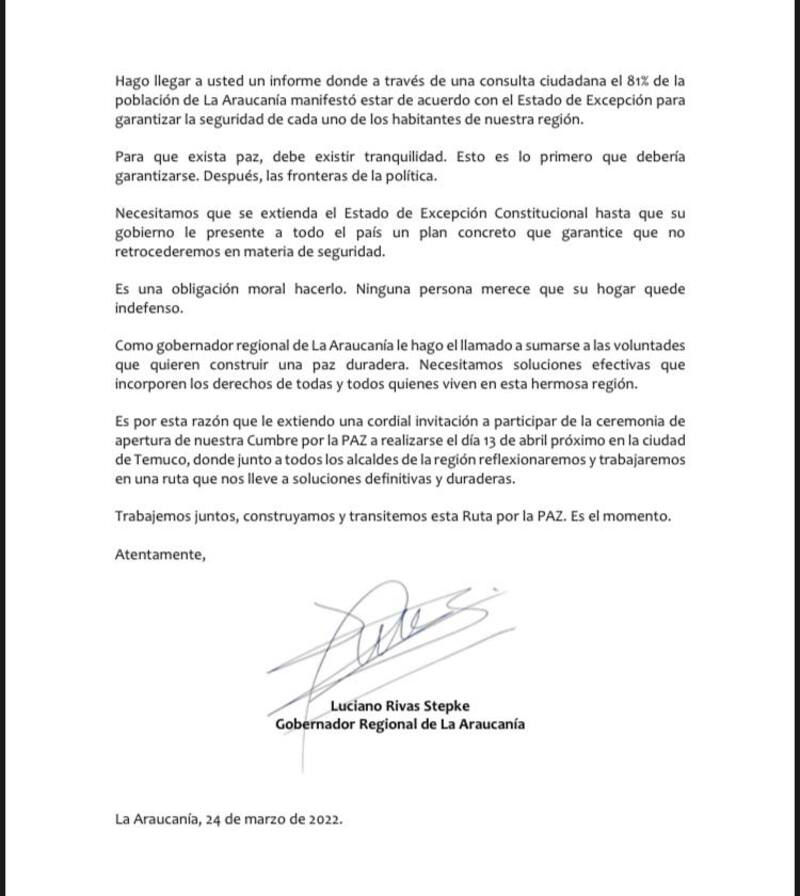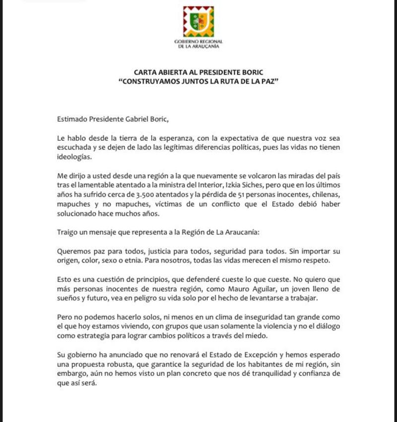 “Me dirijo a usted desde una región a la que nuevamente se volcaron las miradas del país tras el lamentable atentado a la ministra del Interior, Izkia Siches, pero que en los últimos años ha sufrido cerca de 3.500 atentados y la pérdida de 51 personas inocentes, chilenas, mapuches y no mapuches, víctimas de un conflicto que el Estado debió haber solucionado hace muchos años” se lee en la misiva, en la que Rivas afirma que “queremos paz para todos, seguridad para todos. Sin importar origen, color, sexo o etnia”.