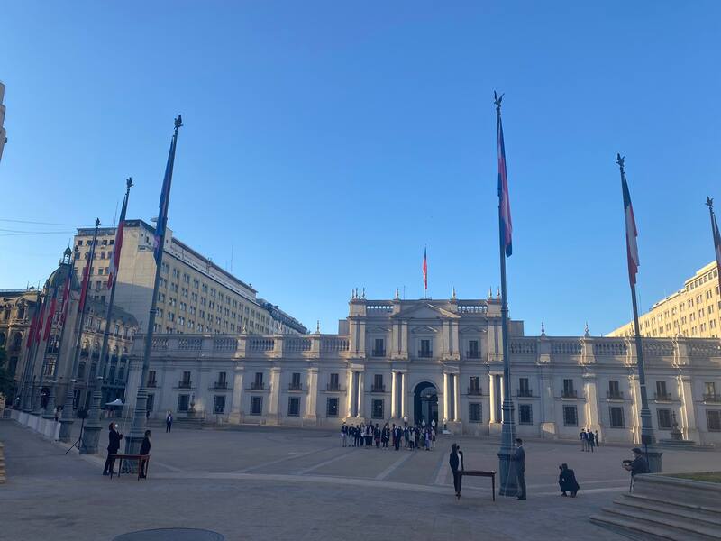 Por primera vez en la Plaza de la Constitución, frente al Palacio de La Moneda, se izó en los mástiles centrales la bandera de la visibilidad trans.