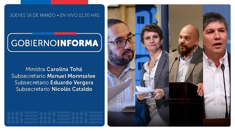 con la participación, en el set de prensa de La Moneda, de la ministra del Interior, Carolina Tohá, junto a sus tres subsecretarios: del Interior, Manuel Monsalve, de Prevención del Delito, Eduardo Vergara, y de Desarrollo Regional, Nicolás Cataldo.