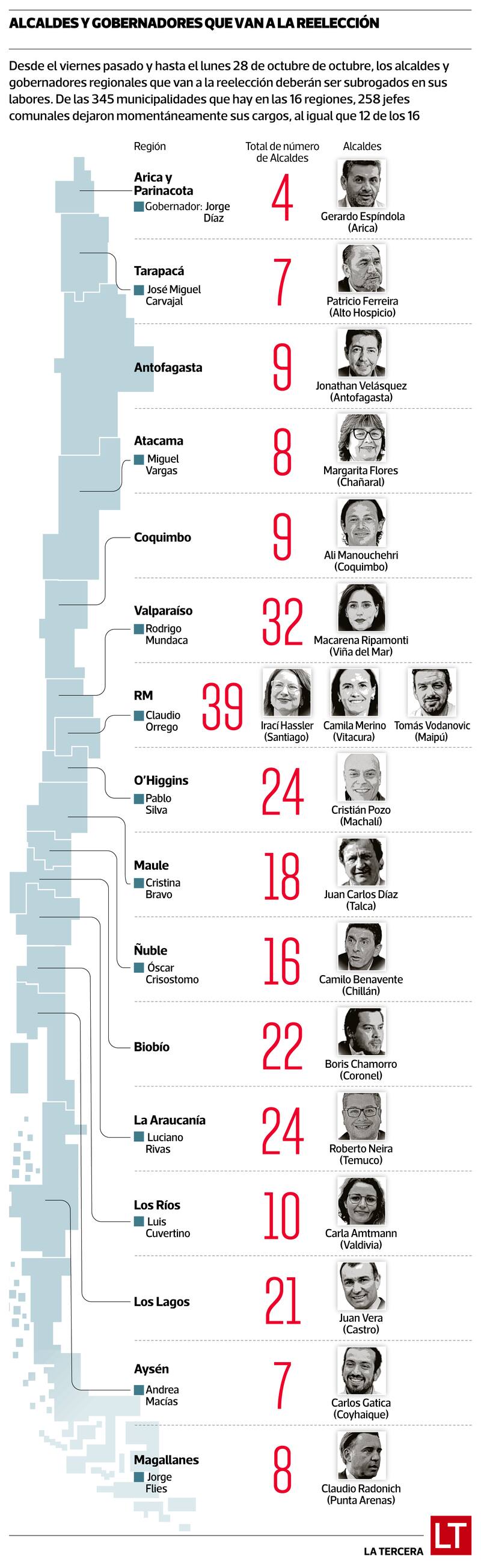 De acuerdo al Servicio Electoral (Servel), las autoridades que buscan la reelección deben retirarse de sus funciones treinta días antes de que se celebren los sufragios (26 y 27 de octubre). En el caso de los jefes comunales, la ley establece que los administradores municipales son los primeros en la línea de subrogancia, aunque los alcaldes pueden designar otra figura por decreto excepcional.