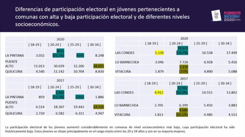 Para ello, el organismo analizó el comportamiento electoral de La Pintana, Puente Alto y Quilicura en los comicios anteriormente mencionados para el rango etario entre 18 y 34 años. Dándose cuenta de un fuerte incremento en los votantes jóvenes, en muchos casos duplicando su asistencia a los centros de votación respecto a las elecciones pasadas.