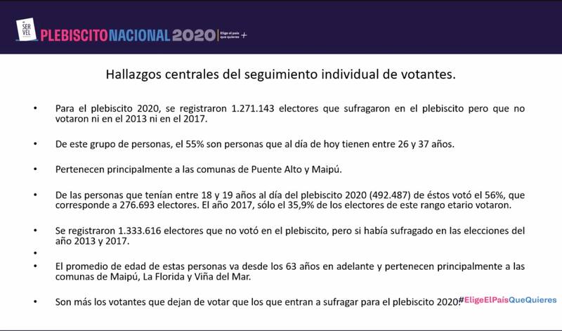 Finalmente, en lo que respecta a participación, el Servel detalló que para el plebiscito, se registraron 1.271.143 electores que sufragaron en dichos comicios pero que no lo hicieron en las elecciones de 2013 ni en el 2017. Y que el 55% son personas que al día de hoy tienen entre 26 y 37 años y pertenecen en su mayoría a Maipú y Puente Alto. Siendo considerados como “votantes nuevos” por el organismo.