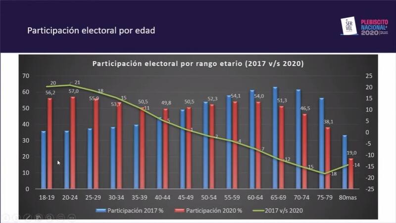 Una situación contraria ocurrió con quienes tenían más edad, donde se vio una baja en la participación en 2020 respecto al 2017. Por ejemplo, en el rango etario de 75 a 79 años se registró una baja de 18% en el plebiscito, comparado con los comicios de hace tres años.