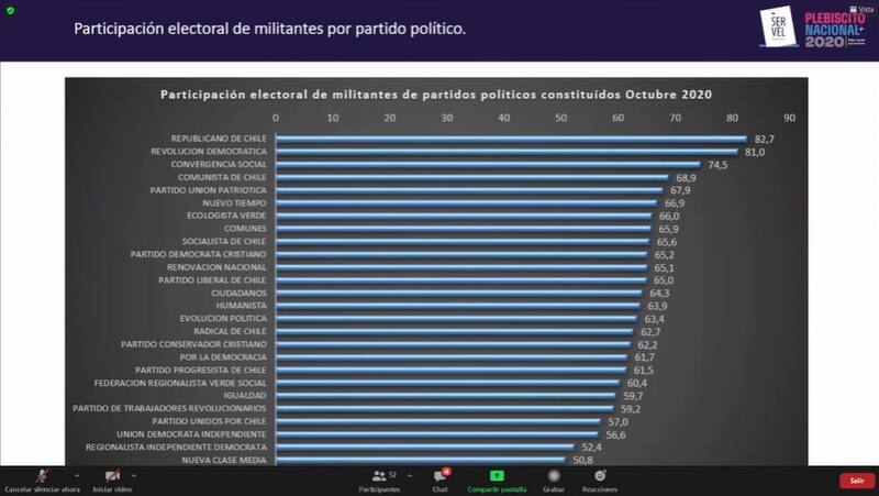 Otra de las cifras que llamaron la atención del análisis realizado por el organismo está la participación de los militantes en partidos políticos. Es así como se dio cuenta que el Partido Republicano fue la colectividad que logró llevar más gente a las urnas, con 82,7% de los inscritos en sus registros. Mientras que en la vereda contraria se encuentra la UDI, donde un 56,6% de sus militantes fueron parte del plebiscito.