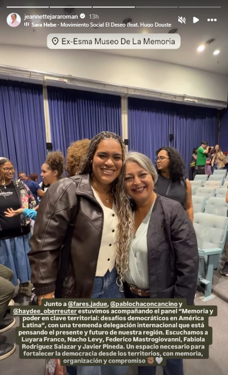 “Hoy estuve en la Casa por la Identidad de Abuelas de Plaza de Mayo, compartiendo con la comisión y con Claudia Poblete, nieta restituida e hija de un migrante chileno detenido desaparecido en Argentina. Su historia nos recuerda que la memoria cruza fronteras y que la búsqueda de verdad y justicia sigue siendo un compromiso irrenunciable”, escribió la militante comunista en una historia en Instagram.