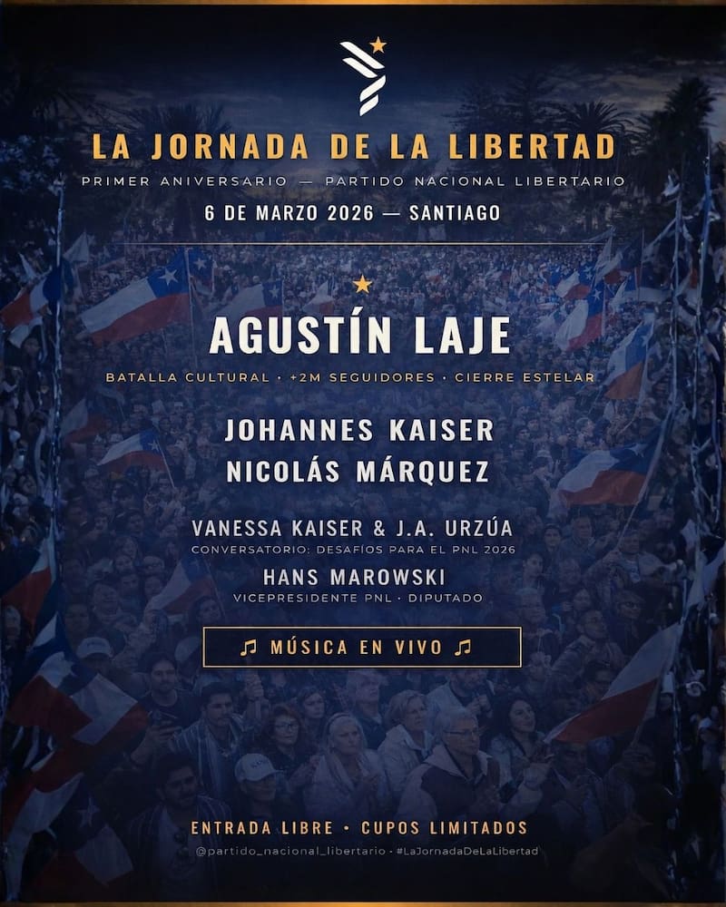 La cita, que se realizará el próximo 6 de marzo en el Teatro Coliseo, contará con la participación de figuras del mundo libertario como el argentino Agustín Laje y -entre otros temas- tendrá como objetivo delinear el rol de la colectividad durante el gobierno de José Antonio Kast.