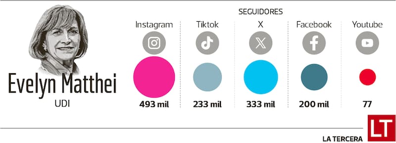 El foco de crecimiento, en todo caso, está en TikTok. Ahí la candidata muestra su faceta más lúdica: recientemente, subió un video con el influencer Dann Mathei, quien imita el recordado video del cruce entre la exministra del Trabajo y la exparlamentaria Marta Isasi. “¡Paremos la huev… Marta!”, dicen en el sketch donde el imitador y la candidata pelean por quién es la verdadera Evelyn Matthei.