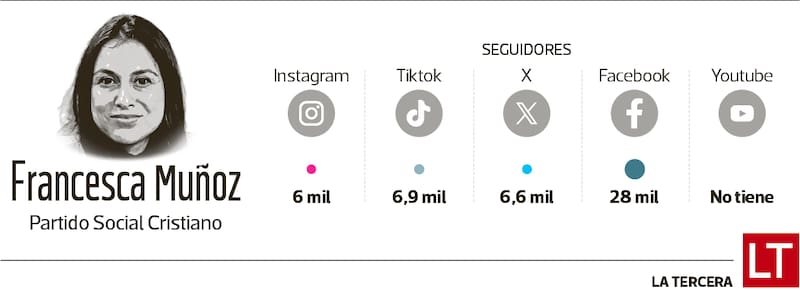 Al respecto, Muñoz aseguró a La Tercera que “estamos trabajando con un grupo de voluntarios del Partido Social Cristiano que apoya mi candidatura (...). Estamos utilizando activamente redes como Twitter, Instagram, Facebook y TikTok. Próximamente lanzaremos una plataforma donde las personas podrán hacer llegar sus preguntas y sugerencias sobre el Chile que desean construir”.