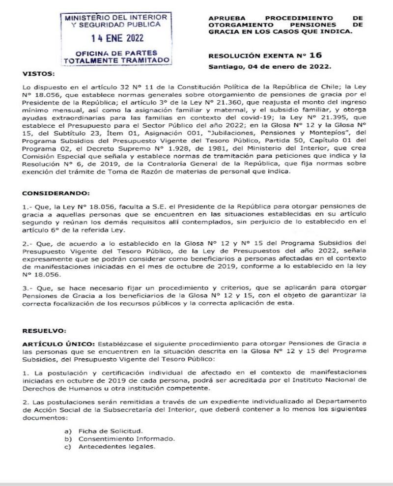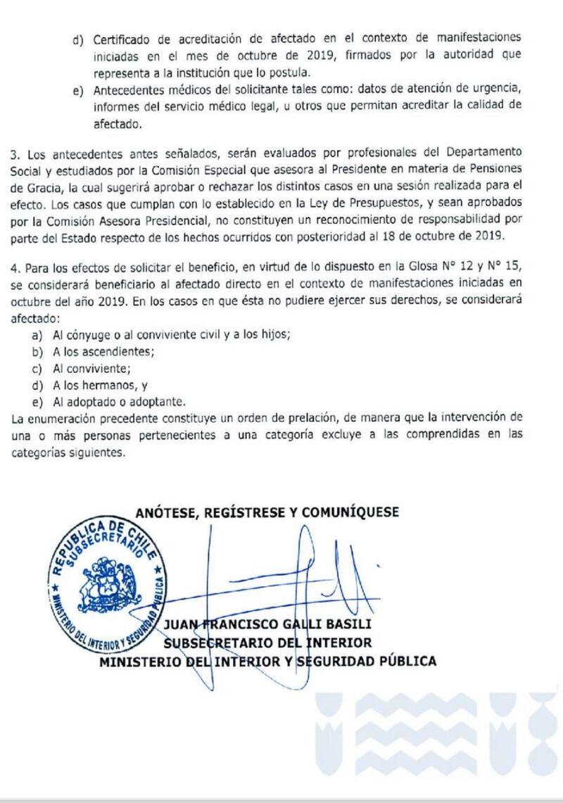 El documento exige que para postular a la pensión de gracia se debe presentar una ficha de solicitud, consentimiento informado, antecedentes legales, certificado de acreditación de afectado “en el contexto de manifestaciones iniciadas en el mes de octubre de 2019, firmados por la autoridad que representa a la institución que lo postula”; y finalmente los antecedentes médicos del solicitante.