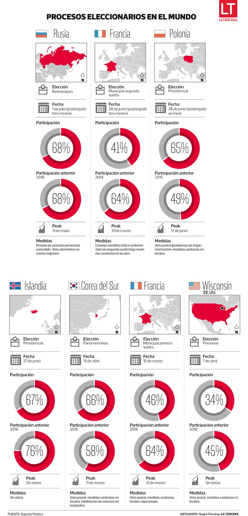 En el informe, además, se hace un análisis comparado de las elecciones realizadas en otros países, donde no se registra un impacto en los contagios, pero sí en la participación (ver infografía).