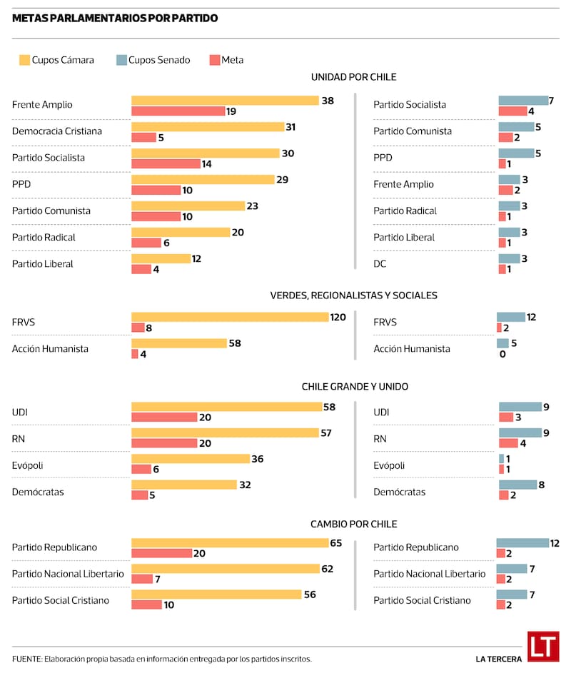 En total, esta alianza aspira a obtener 51 diputados y diez senadores (estos últimos, sin considerar a los que se encuentran en la mitad de su período).