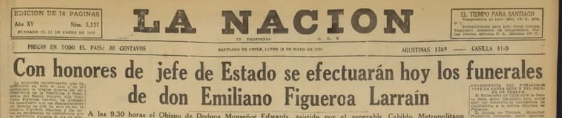 El Presidente Emiliano Figueroa gobernó Chile entre 1925 y 1927, saliendo del poder por presión de Carlos Ibáñez del Campo, quien lo sucedió y quien se mantenía como nuevo Jefe de Estado en el momento de la muerte de Figueroa, el 15 de mayo de 1931.