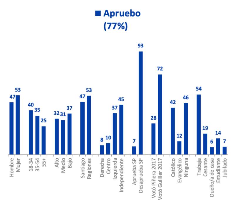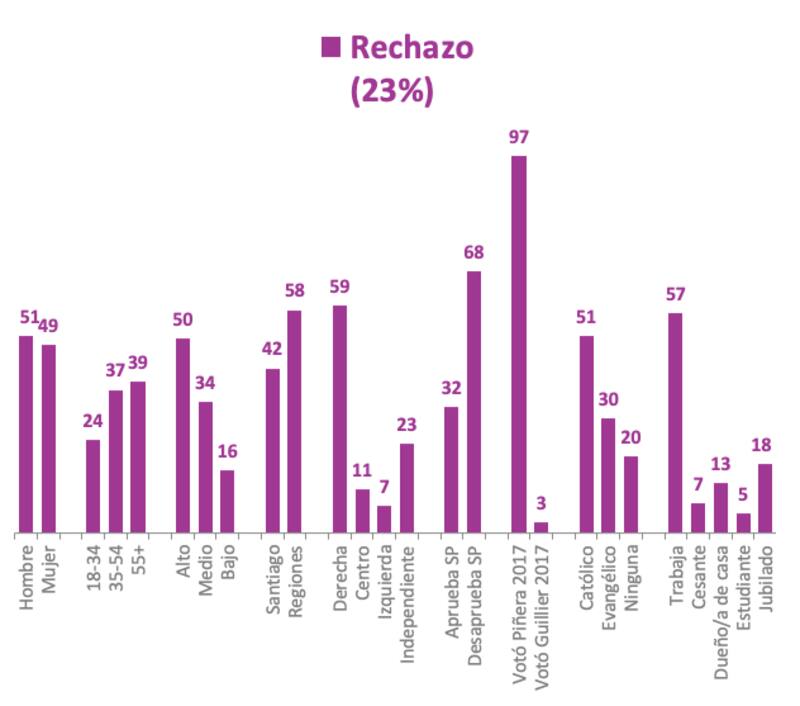 El mismo domingo, la firma Cadem realizó un sondeo en el que se reflejó -con apenas un punto de diferencia- el resultado final de los comicios: 77% contestó Apruebo y 23% Rechazo, contra 78,27% y 21,73% del cómputo final. Y a partir de ese estudio, realizó varios cruces, uno de los cuales buscó apuntar a cómo se componen los votos del Apruebo y el Rechazo. De las respuestas aparecen elementos de interés para analizar.