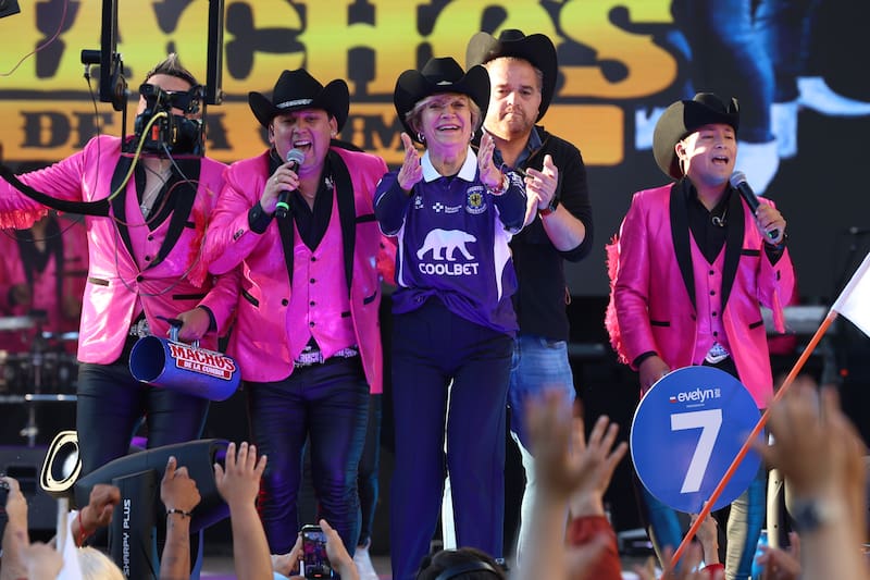 “Aplausos para la futura presidenta de Chile”, dijo el vocalista del grupo, al momento de recibir sobre el escenario a Matthei en un saludo inicial. En la instancia también le hizo entrega de una camiseta de Deportes Concepción, la cual se puso al instante y aprovechó de bailar frente a los presentes.