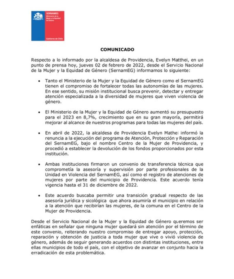 El SernamEG, por su parte, también emitió un comunicado contrarrestando la versión de Matthei.