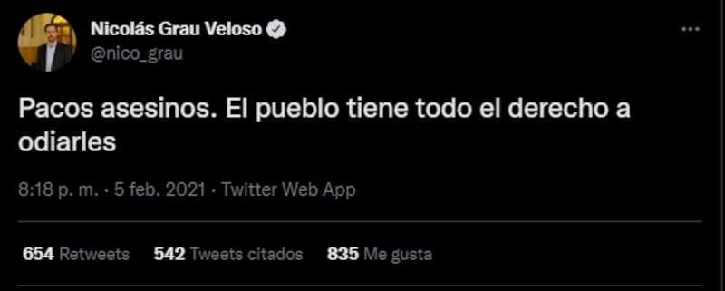 “Pacos criminales y asesinos. Espero que todos ustedes y sus jefes políticos paguen alguna vez por todo el daño causado”, escribió Grau el 3 de octubre de 2020, publicación que fue criticada desde la oposición en donde se pidió que el titular de la cartera renunciase a su cargo.