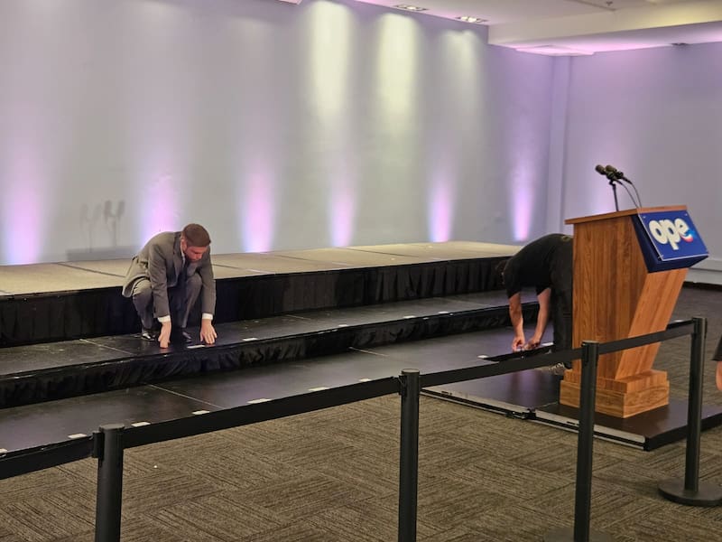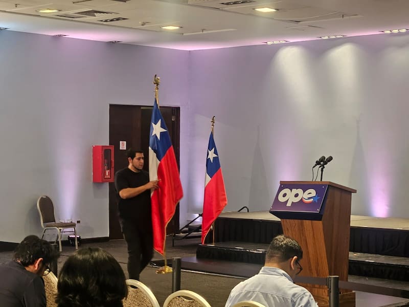 En medio de la demora y la expectación por el inicio de la ceremonia de nombramientos, se instalan banderas de Chile en el escenario donde se anunciará quiénes completarán el gabinete de Kast y quiénes serán las autoridades regionales designadas por el republicano.