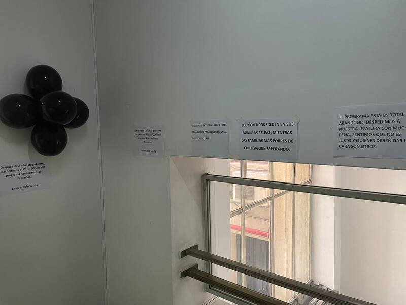 Este miércoles la oficina del Programa de Asentamientos Precarios del Ministerio de Vivienda despertó con globos negros y varios mensajes pegados en las paredes por la salida del socialista Ricardo Trincado en medio de los nuevos antecedentes revelados por el caso Democracia Viva.