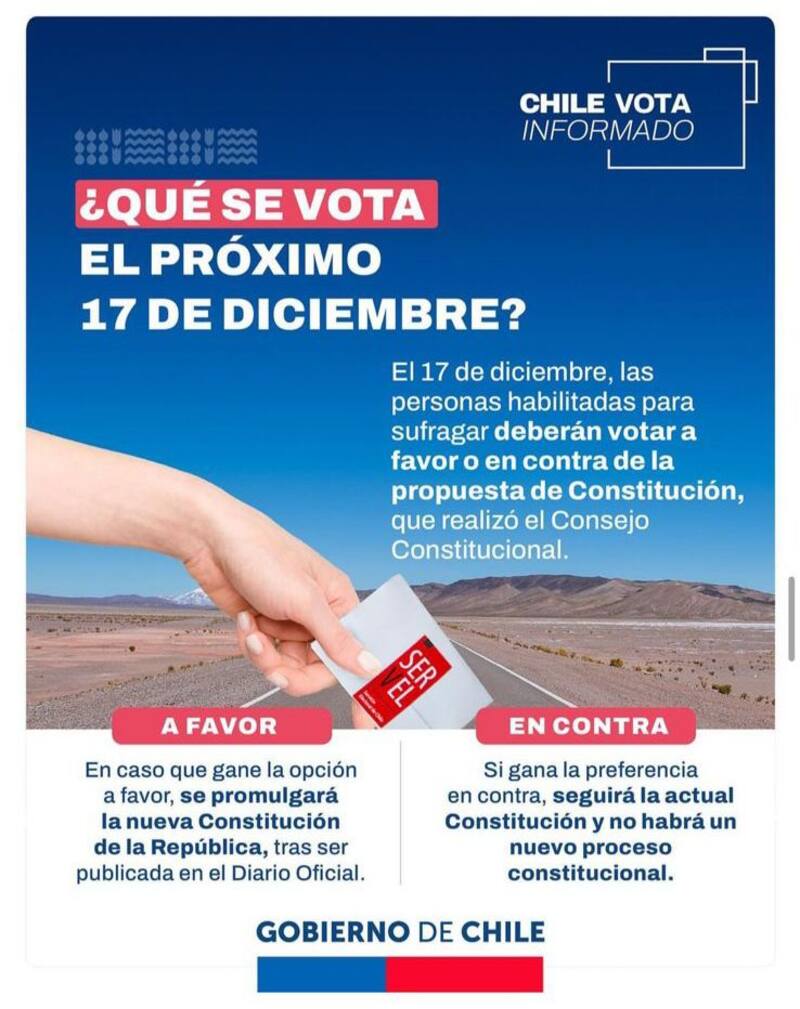 Hace seis días la cuenta de la Secretaría General de Gobierno (Segegob) compartió en su cuenta de X un afiche de la campaña “Chile vota informado” para difundir información del próximo plebiscito del 17 de diciembre en que se votará la nueva propuesta constitucional.