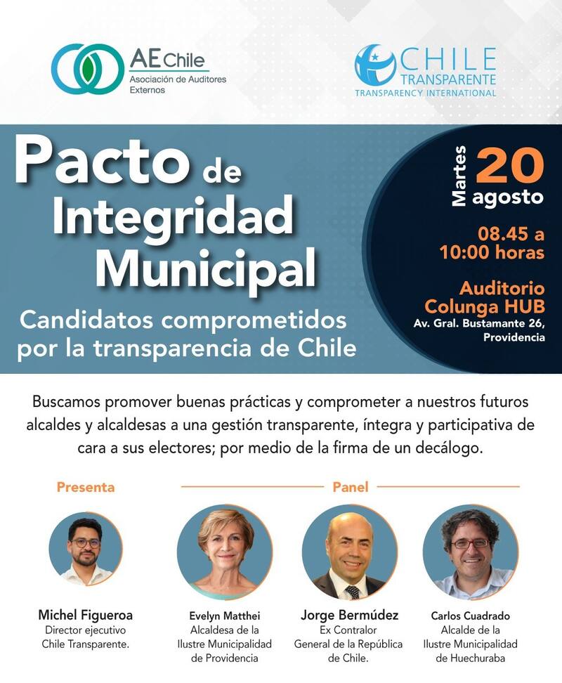 Para el próximo martes 20 de agosto está programado el lanzamiento del decálogo Pacto de Integridad Municipal 2024, de Chile Transparente y la Asociación de Auditores Externos, que establece 10 medidas que buscan minimizar la corrupción en los municipios. Esto, de cara a las elecciones municipales del próximo 27 de octubre.