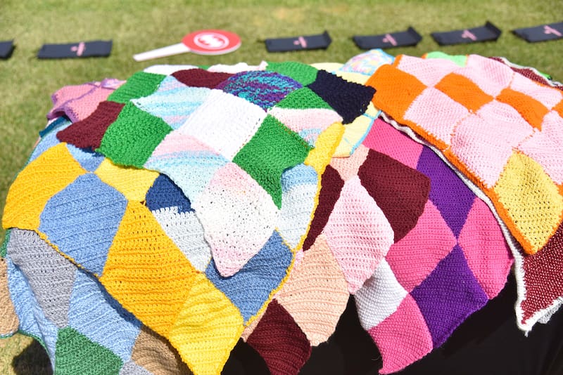 Los rombos gigantes estaban hechos de 500 mantas de lana que, a su vez, estaban formadas por 8.500 rombos pequeños. Este material fue elaborado por personas que se sumaron a la campaña realizada entre julio y noviembre de este año.