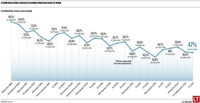 Según datos del Servel, un 47% del padrón habilitado para votar asistió ayer a las urnas. La asistencia fue menor que para el plebiscito de 2020, pero casi idéntico al porcentaje de asistencia de la elección que permitió al Presidente Sebastián Piñera pasar a segunda vuelta en 2017.