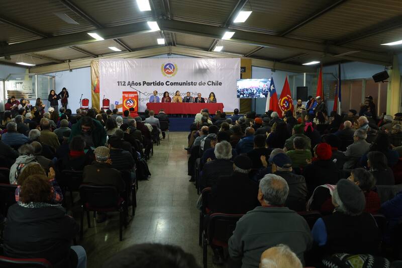 En el salón de actos de la Central Unitaria de Trabajadores, en la sede de la organización en el centro de Santiago, el Partido Comunista realizó este martes un acto por su aniversario 112°, con un discurso central a cargo del presidente de la colectividad, Lautaro Carmona.