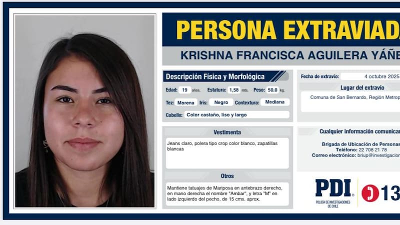 La Policía de Investigaciones (PDI) continúa las diligencias para dar con el paradero de Krishna Aguilera Yáñez, joven de 19 años que fue vista por última vez el 4 de octubre en la comuna de San Bernardo, cerca del Consultorio Raúl Brañes.