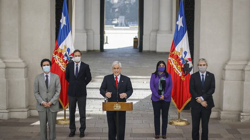 Durante su intervención, el Mandatario estuvo flanqueado por los miembros de su comité político, compuesto los ministros de Interior, Gonzalo Blumel; de Hacienda, Ignacio Briones; de la Secretaría General de la Presidencia, Felipe Ward y la vocera de gobierno Karla Rubilar.