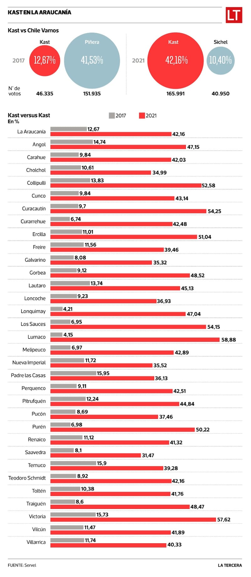 Incluso la comparativa de Kast 2021 versus Kast 2017 es sorprendente. Hace cuatro años, el candidato apenas superó el 15% de las preferencias en tres comunas de la región y en algunas, como la ya mencionada Lumaco, apenas obtuvo votos (4,15% esa vez).