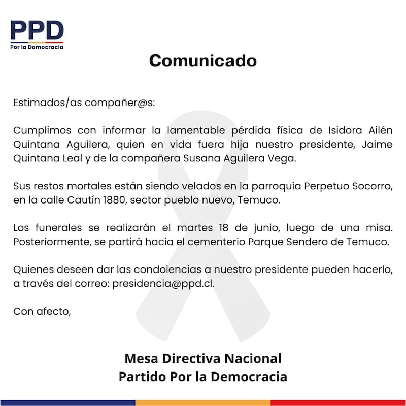 “Cumplimos con informar la lamentable pérdida física de Isidora Ailén Quintana Aguilera, quien en vida fuera hija de nuestro presidente, Jaime Quintana Leal y de la compañera Susana Aguilera Vera”, señala el escrito.