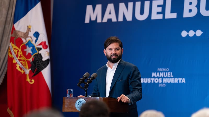El Presidente realizó la entrega del Premio Manuel Bustos Huerta 2025 a Olimpia Riveros Ravelo y Luis Fuentealba Reyes, en compañía del ministro del Trabajo y Previsión Social, Giorgio Boccardo; el subsecretario del Trabajo, Pablo Chacón, y el director nacional del Trabajo (s), Sergio Santibáñez.