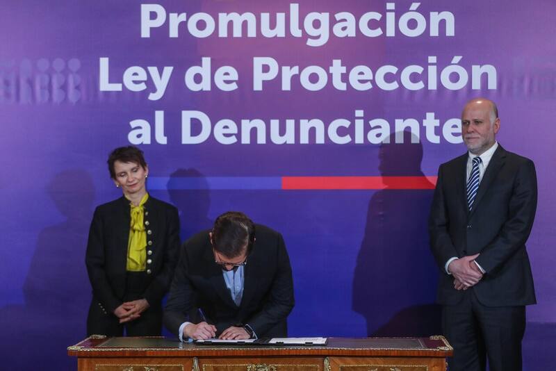 “Estamos promulgando la Ley de Protección a quienes denuncian hechos de corrupción o faltas de probidad en la administración pública, que va a facilitar la detección de casos de corrupción, pues va a proteger a los funcionarios que sean testigos o víctimas de estos hechos y que, por diferentes motivos, no se atrevían a denunciar, ya sea por temor, amenaza a represalias o cualquiera de estas”, señaló el Mandatario.