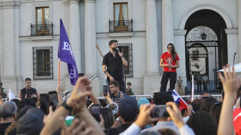 El Mandatario salió de La Moneda y pronunció, desde una tarima, un discurso ante cientos de personas que se congregaron en la Plaza de la Constitución para respaldar su gestión, en el marco del segundo aniversario desde que asumió su mandato.