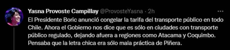 “El Presidente Boric anunció congelar la tarifa del transporte público en todo Chile. Ahora el Gobierno nos dice que es sólo en ciudades con transporte público regulado, dejando afuera a regiones como Atacama y Coquimbo”, reclamó mediante su cuenta de Twitter.