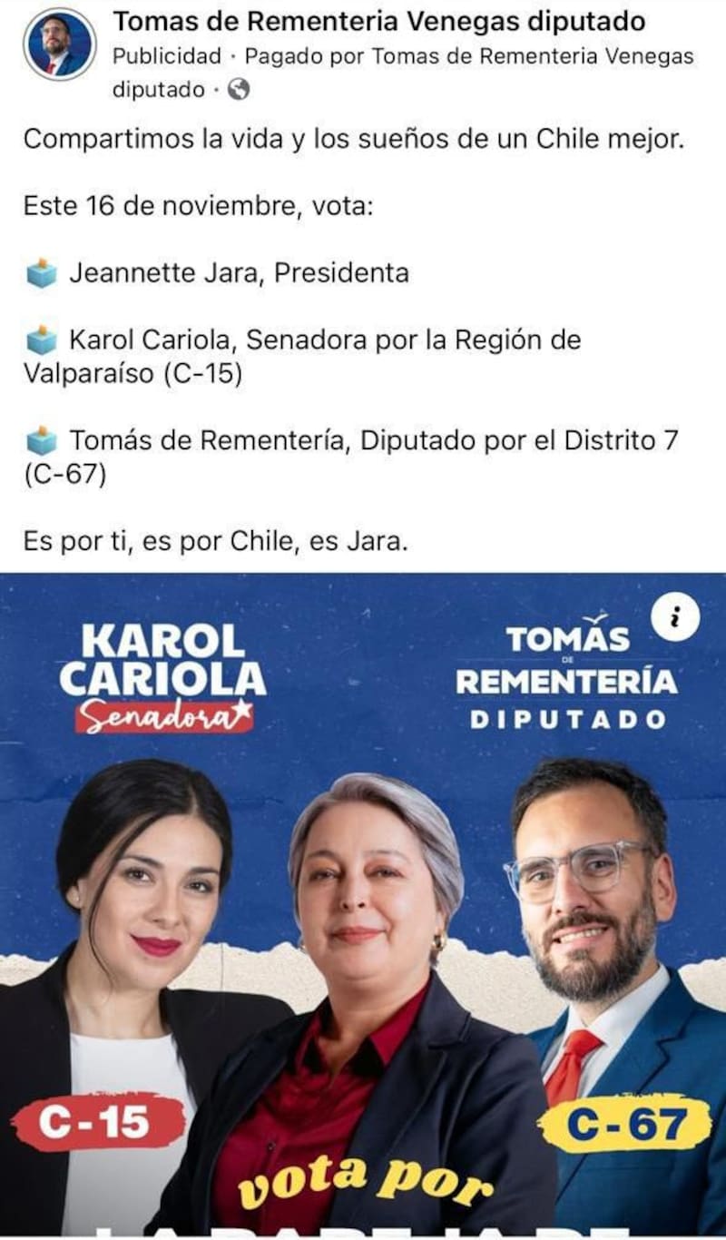La dirección regional Valparaíso del Partido Socialista de Chile, rechazó esta jornada la difusión de un afiche digital de campaña en las redes sociales del senador Tomás de Rementería, en donde promueve la candidatura de su pareja, la diputada Karol Cariola (PC) al Senado por la Región de Valparaíso.