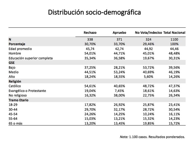 Los resultados del sondeo, aplicado semanas antes del 4 de septiembre, reflejan que quienes cambiaron su postura respecto del plebiscito de entrada fue poco menos del 10%, el segmento se compone más por hombres que por mujeres y provienen fundamentalmente del rango etario de 30 a 54 años. Además el estudio permite pensar que el segmento que no responde la pregunta respecto al referéndum terminó votando por la opción Rechazo.