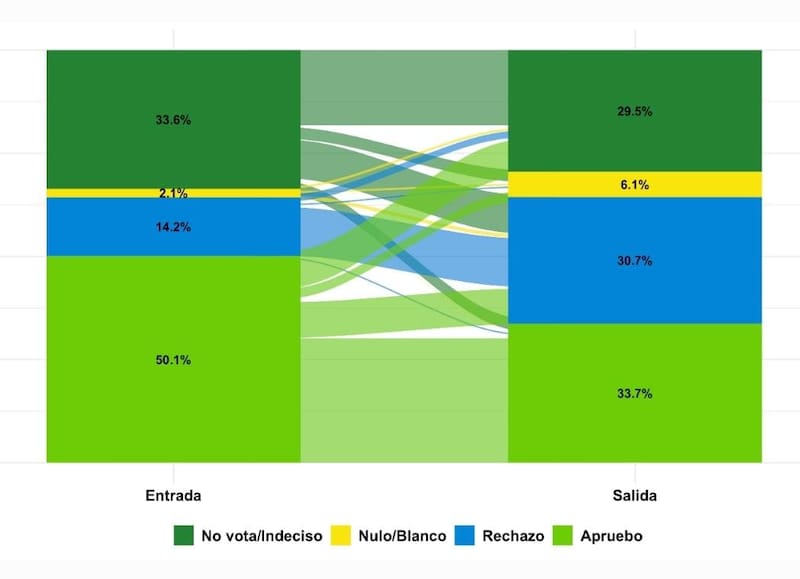 Los datos reflejan además que hubo una reducida fuga de votos de votos de quienes votaron por el cambio constitucional en el plebiscito de entrada en 2020 y que en el plebiscito de salida se decantaron por la opción Rechazo. Se trata de poco menos del 10% de quienes respondieron la encuesta.