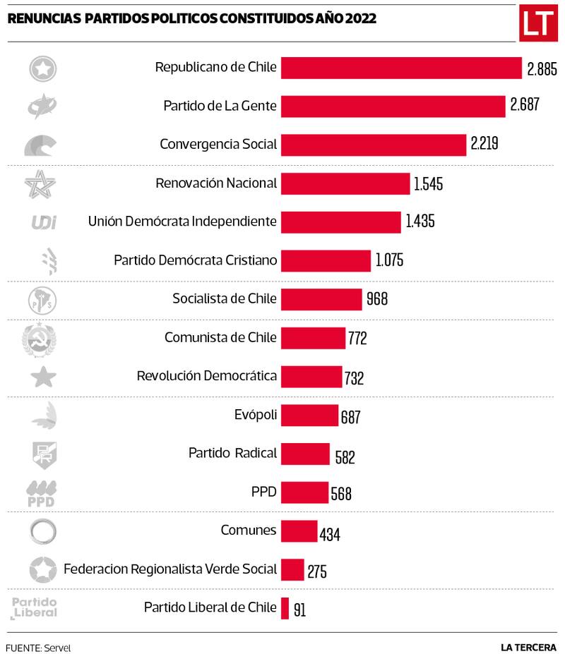 Sin embargo, de acuerdo a información aportada por el Servel, no son los partidos que encabezan el número de renuncias. En otras de las colectividades ha habido bajas más silenciosas, pero sostenidas a lo largo de los meses.