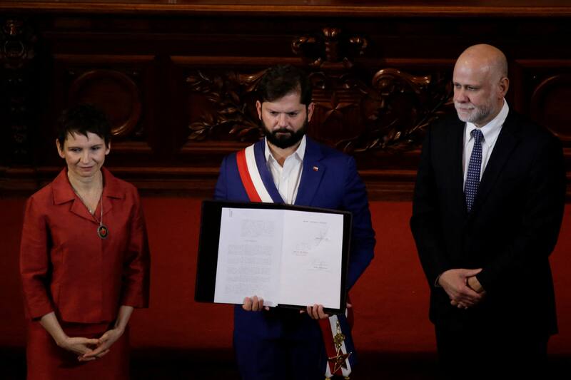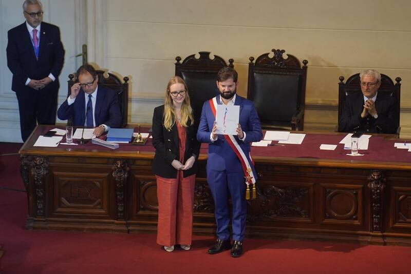 Una vez finalizada su alocución, a las 9.09 horas Hevia entregó oficialmente el proyecto de nueva constitución al Presidente Boric.