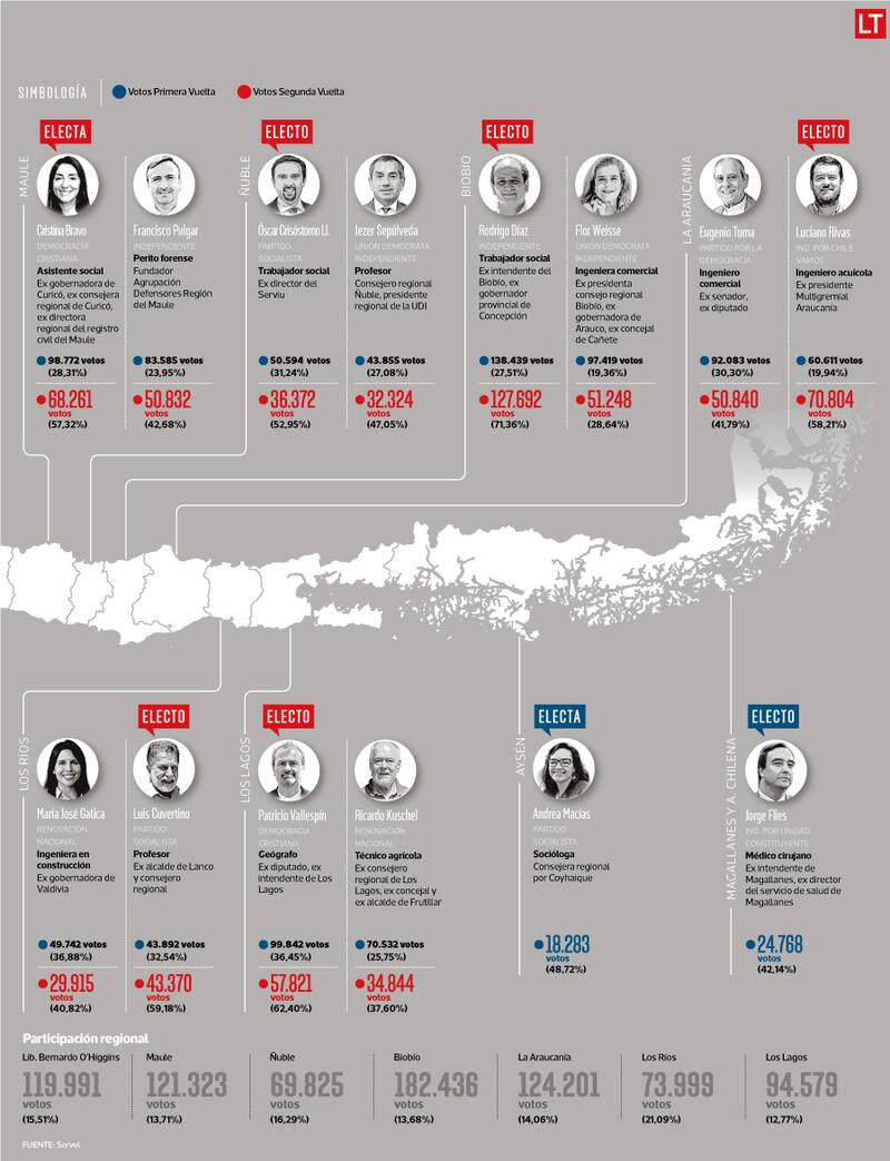 El caso extremo fue el de Patricio Vallespín en Los Lagos: si en mayo él obtuvo 99.842 votos, el 36,45%, esta vez la votación total de la región en el balotaje fue de 92.665, es decir, siete mil sufragios menos que lo que el postulante había obtenido en solitario el 15 y 16 de mayo. El exdiputado DC ganó holgadamente, eso sí, con 57.821 respaldos (62,40%).