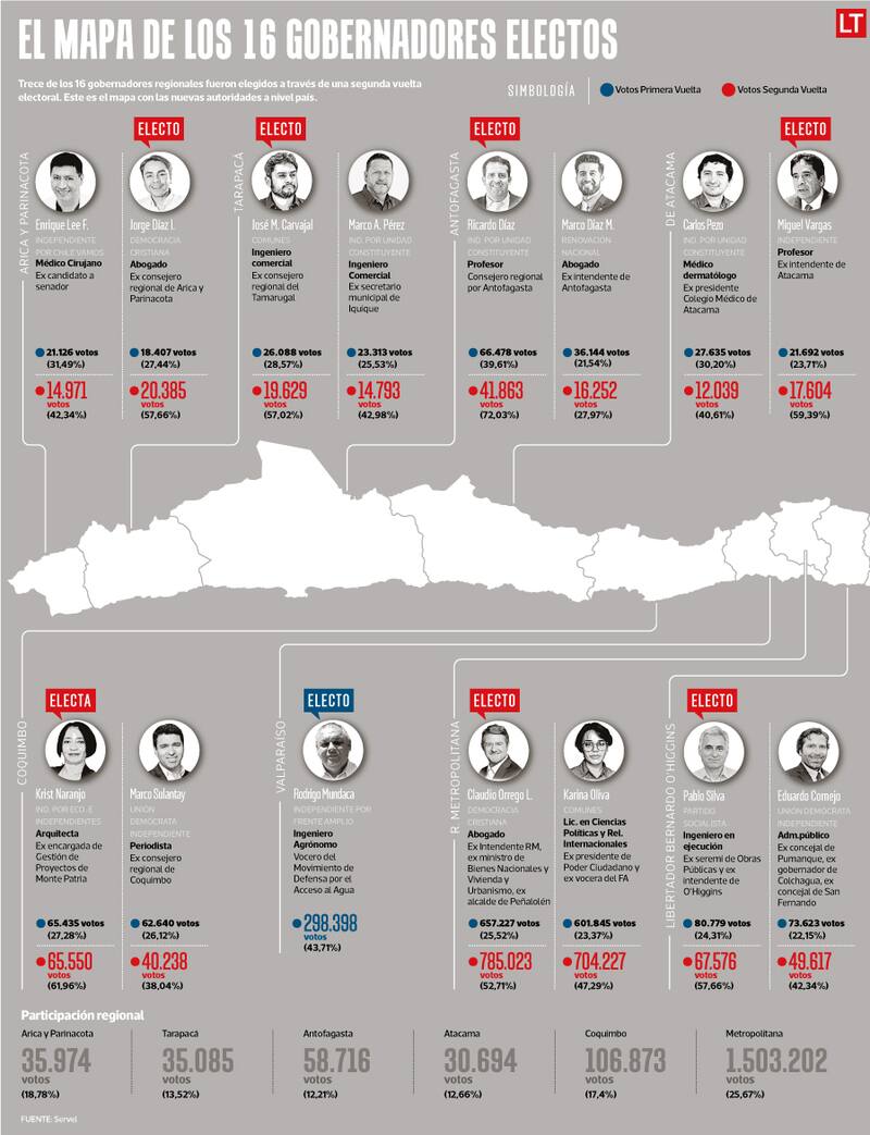 En esos casos, la cantidad de votantes fue apenas un tercio de los que habían acudido hace un mes atrás, con 37% en Antofagasta, 40,16% en Atacama y 41,29% en Los Lagos. Y provocó una curiosidad: las tres autoridades electas en esta ocasión se impusieron con menos votos que los que habían obtenido en la primera vuelta.