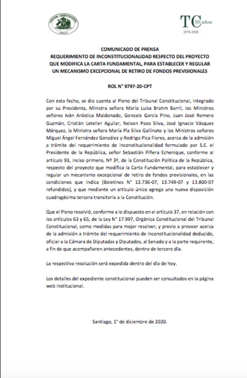Posteriormente y a través de un comunicado de prensa el pleno confirmó que “resolvió, conforme a lo dispuesto en el artículo 37, en relación con los artículos 63 y 65, de la Ley N° 17.997, Orgánica Constitucional del Tribunal Constitucional, como medidas para mejor resolver, y previo a proveer acerca de la admisión a trámite del requerimiento de inconstitucionalidad deducido, oficiar a la Cámara de Diputadas y Diputados, al Senado y a la parte requirente, a fin de que acompañaren antecedentes, dentro de tercero día”.