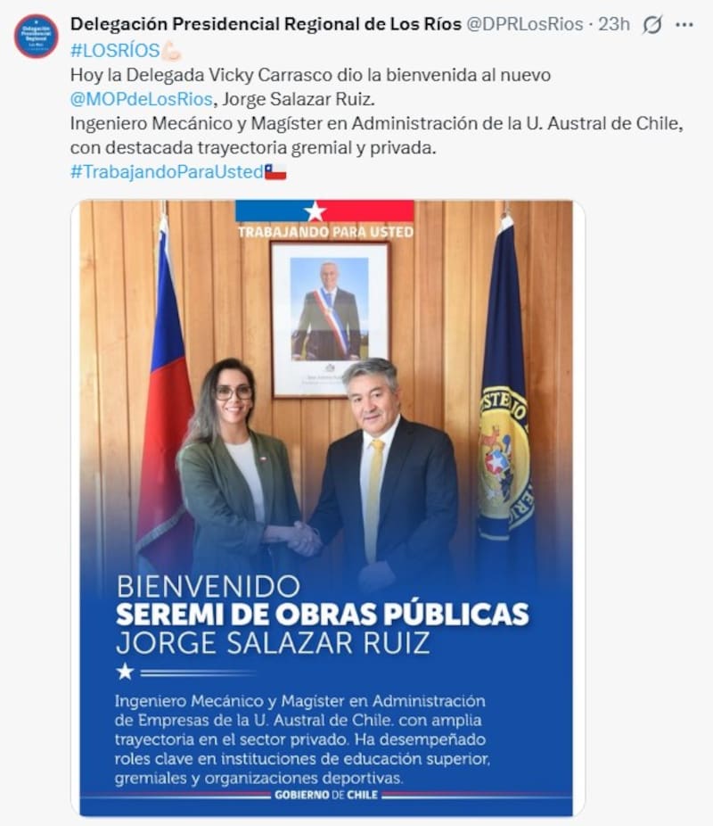 Habría durado menos de 24 horas. Este viernes, la Delegación Presidencial de Los Ríos anunció que desistió del nombramiento del Seremi de Obras Públicas de la región, el ingeniero mecánico Jorge Salazar Ruiz.