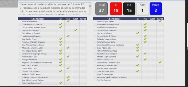 La solicitud del Ejecutivo fue visada con 19 votos a favor -entre ellos el de la presidenta del Senado, Ximena Rincón (DC)- 15 en contra y 1 abstención. De esta manera, la medida que tenía como fecha de vencimiento este 26 de diciembre se prolonga por 15 días más, es decir, hasta el 10 de enero.