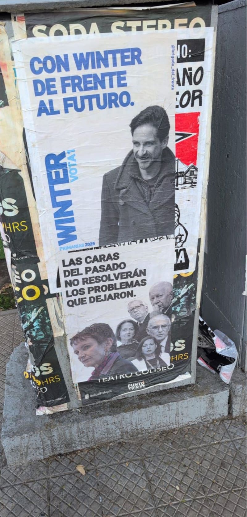 Un elemento que sumó tensión a la discusión dentro del oficialismo fue un afiche, que fue ampliamente difundido en redes sociales durante el fin de semana, en que se ve a Tohá, Vodanovic, Sergio Bitar, Ricardo Lagos, Jorge Burgos y Soledad Alvear. Los acompaña un mensaje: “Las caras del pasado no resolverán los problemas que dejaron”. Sobre él hay otro afiche: uno en favor de la candidatura de Gonzalo Winter.
