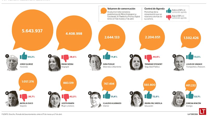 Por una amplia ventaja, el titular de Hacienda, Jorge Quiroz, es el ministro con mayor presencia mediática, con más de cinco millones y medio de menciones en la prensa y plataformas sociales en este primer mes. De ellas, un 69,2% estuvieron relacionadas con los temas propios de su cartera, lo cual lo convierte en uno de los secretarios de Estado con mayor control de la agenda.