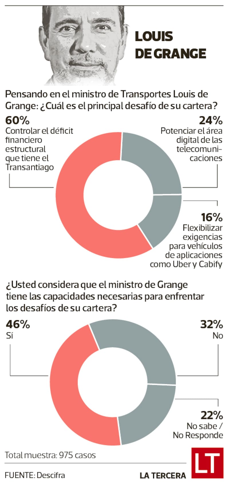 En el puesto número cinco de presencia mediática aparece su par de Transportes y Telecomunicaciones, Louis de Grange. El alza de las bencinas y el petróleo también lo puso en el centro de la polémica, y debió enfrentar el reclamo de usuarios del Transantiago por una supuesta caída en la frecuencia de los buses, que el ministro desmintió.