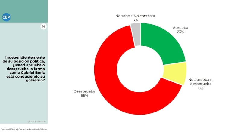 A su vez, en este último sondeo de la CEP, ante la pregunta: “Independientemente de su posición política, ¿usted aprueba o desaprueba la forma como Gabriel Boric está conduciendo su gobierno? Un 8% “no aprueba ni desaprueba” y un 3% ”no sabe o no contesta".