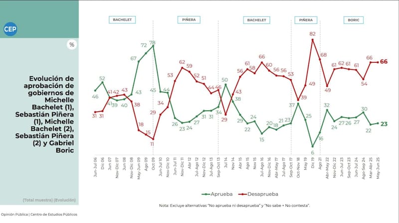 La cifra además es similar a la peor evaluación que obtuvo la expresidenta Michelle Bachelet en su segunda gestión, cuando entre los meses de julio y agosto de 2016, obtuvo el mismo 66%. Y lejana aún al 82% de rechazo que obtuvo el expresidente Sebastián Piñera en diciembre de 2019, dos meses después del inicio del estallido social.